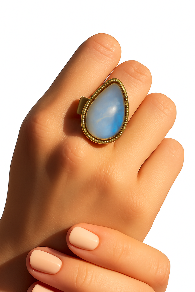 Rainbow Moonstone Teardrop Ring Set in 24k electro-formed  gold; adjustable band.
