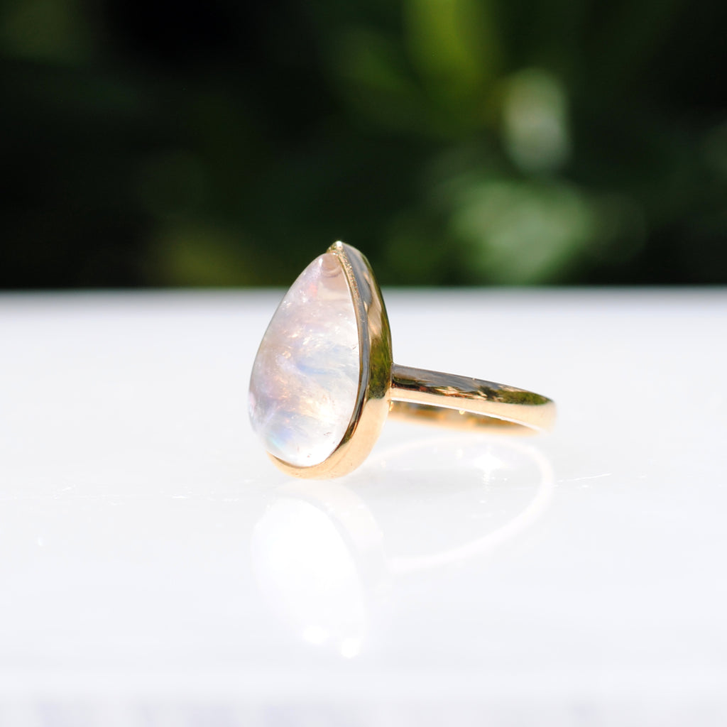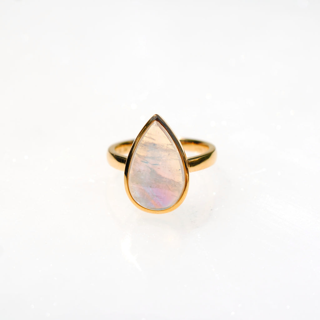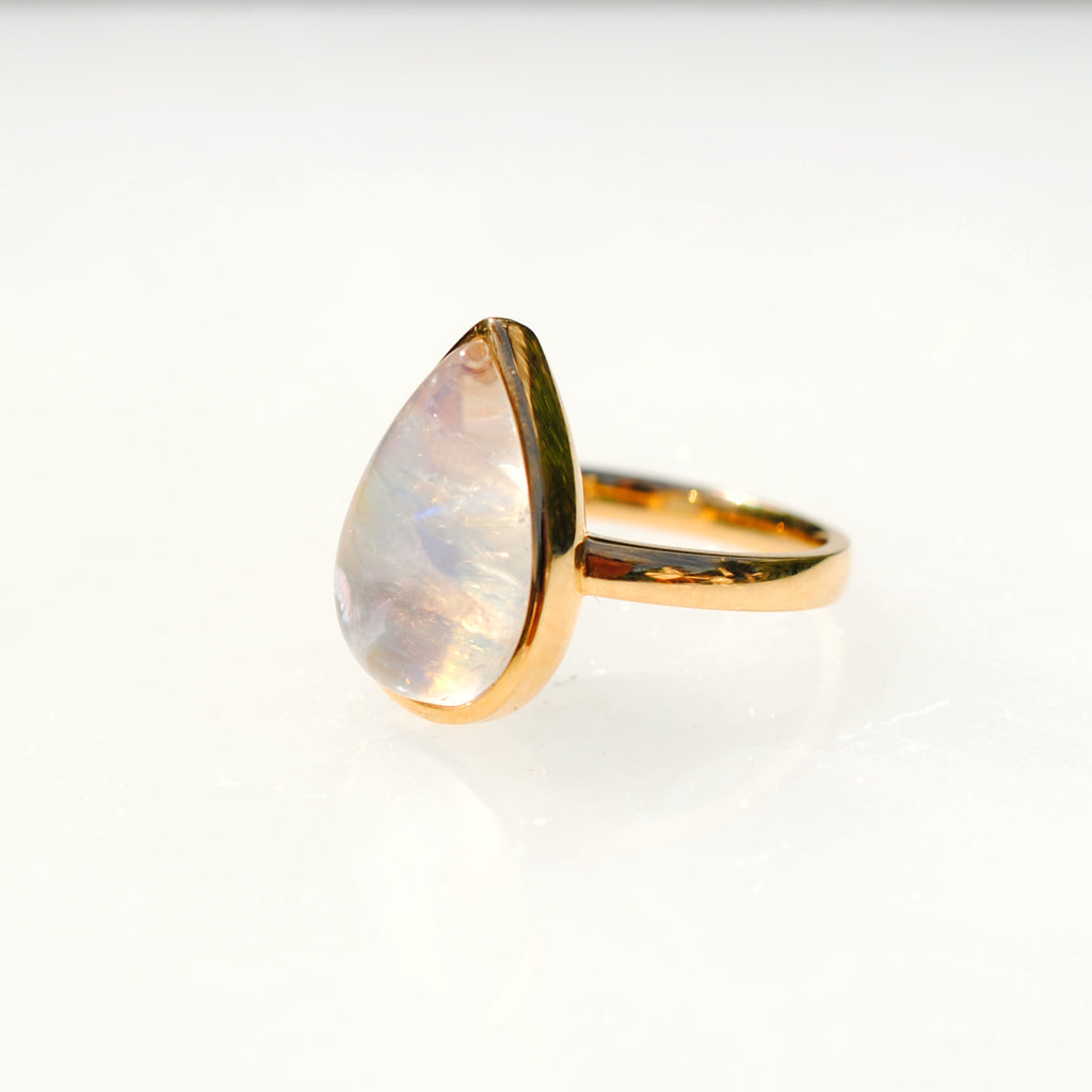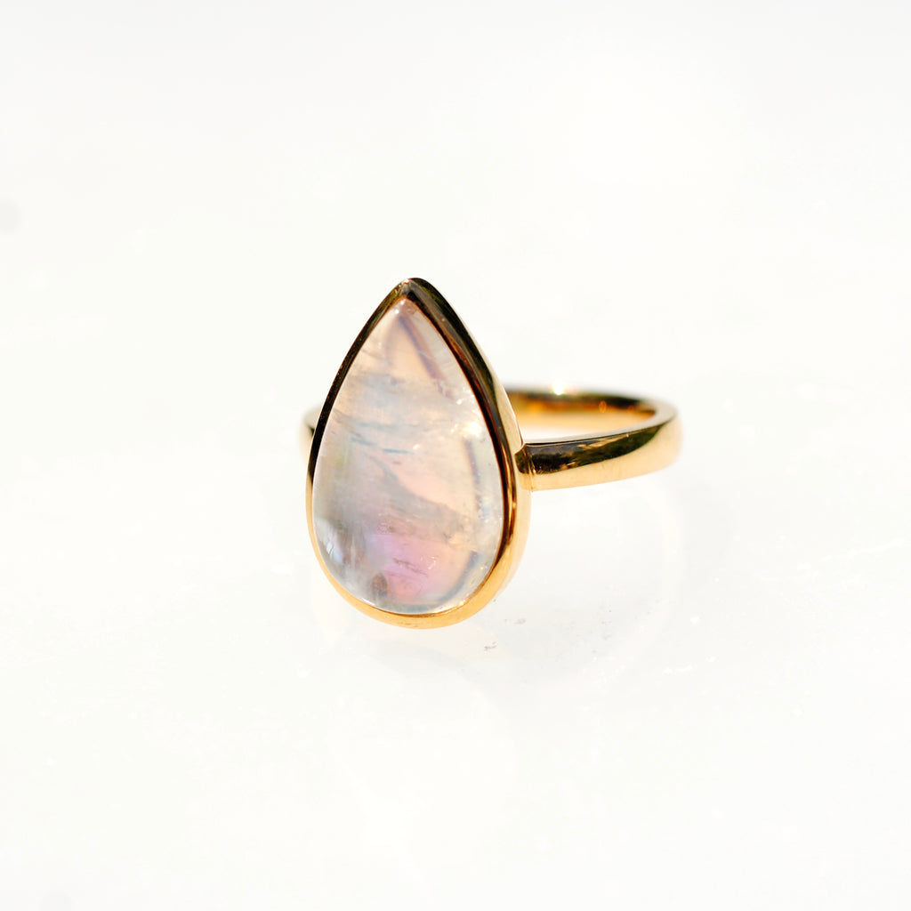 Large 18k Yellow Gold Rainbow Moonstone Teardrop Ring. The perfect modern ring for all occasions. This statement ring is calling.