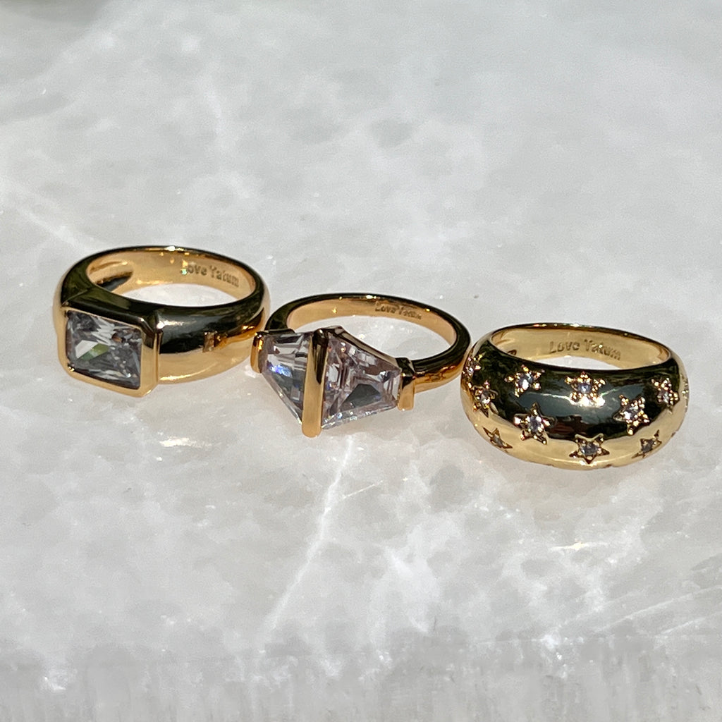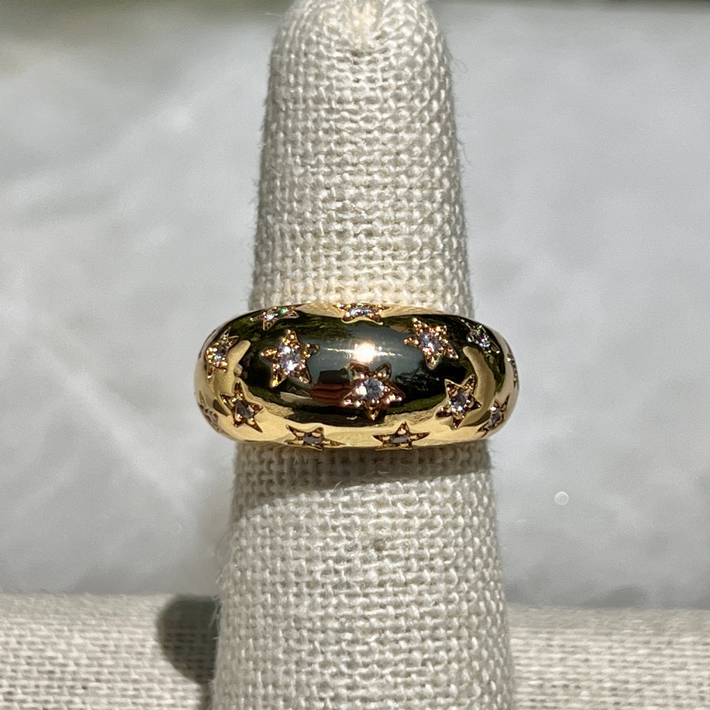 Thick cigar band inspired band with round edges. Mini star engravings filled with mini cubic zirconia's. A statement ring paired with the Dottie Ring and its a showstopper! Note: We highly suggest sizing up as the band is thick so you will want a whole size bigger than your usual ring size.
