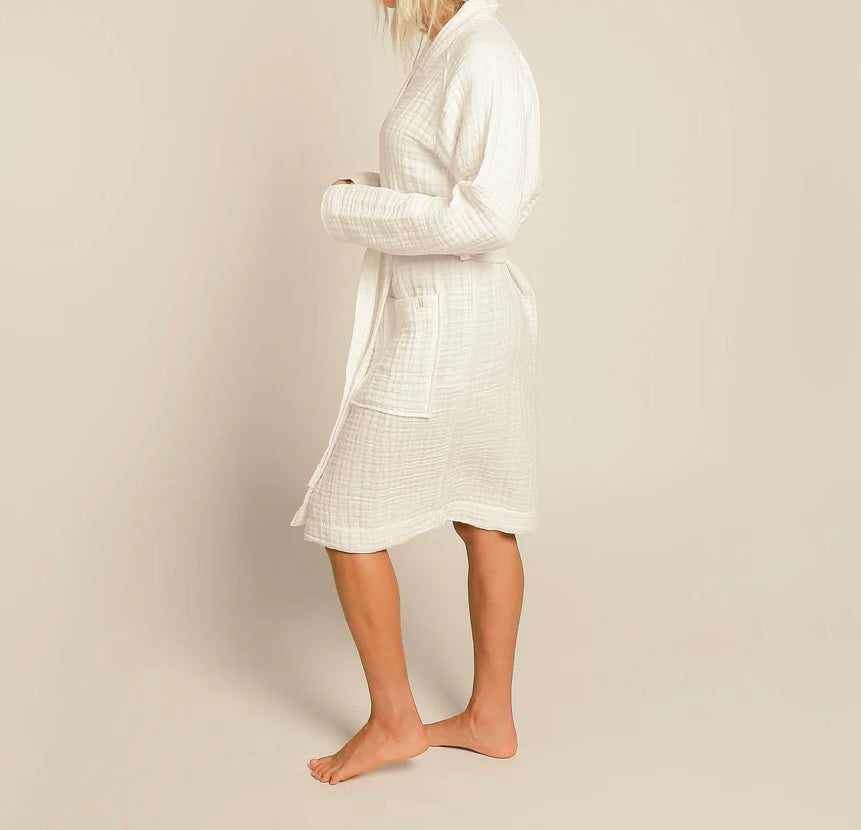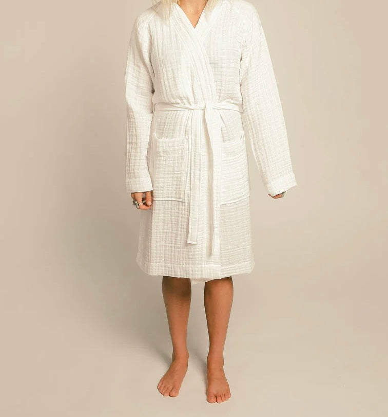 Get down with Gauze. This new featherweight gauzy woven robe is the perfect lofty layer to cozy up to all year round. This super soft, highly absorbent, breathable weave breaks into a beautiful texture after wearing & washing. We designed this unisex style with a raglan style sleeve so you never feel a seam and two large patch pockets to store your lounging essentials.