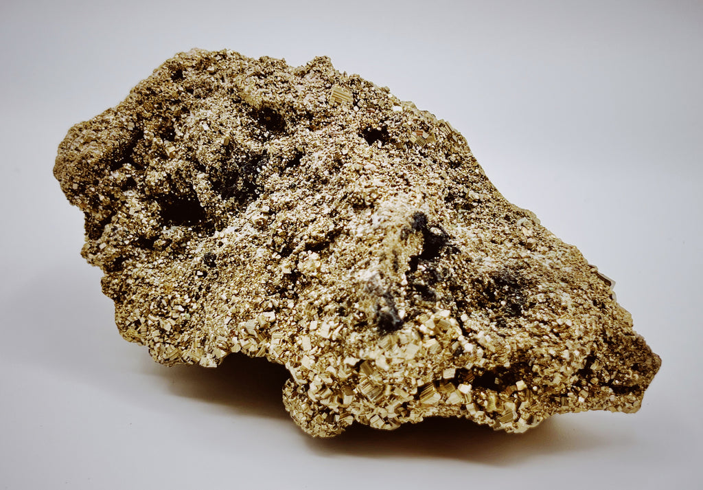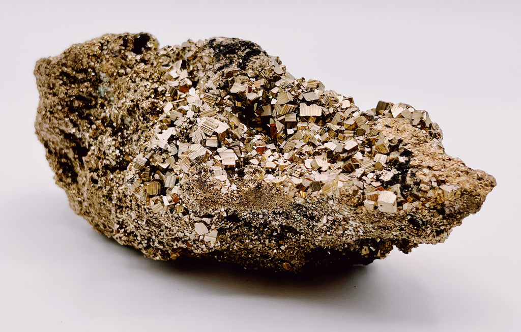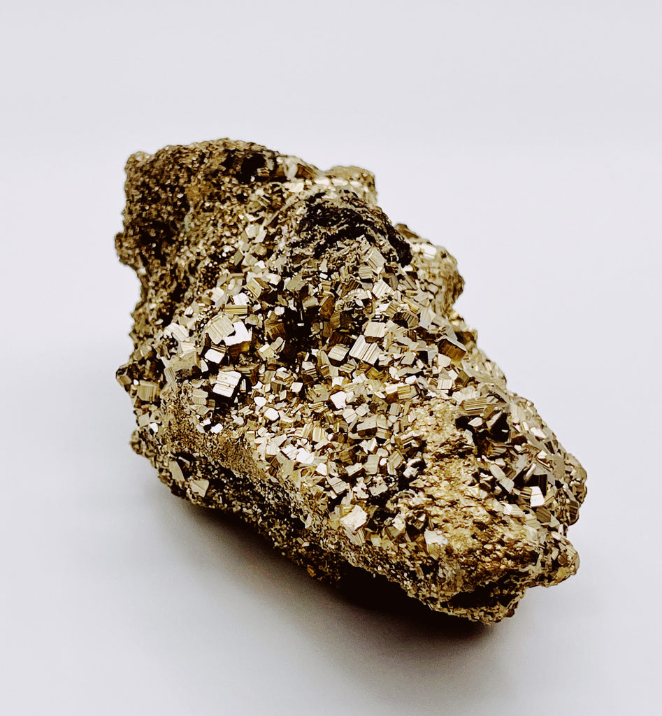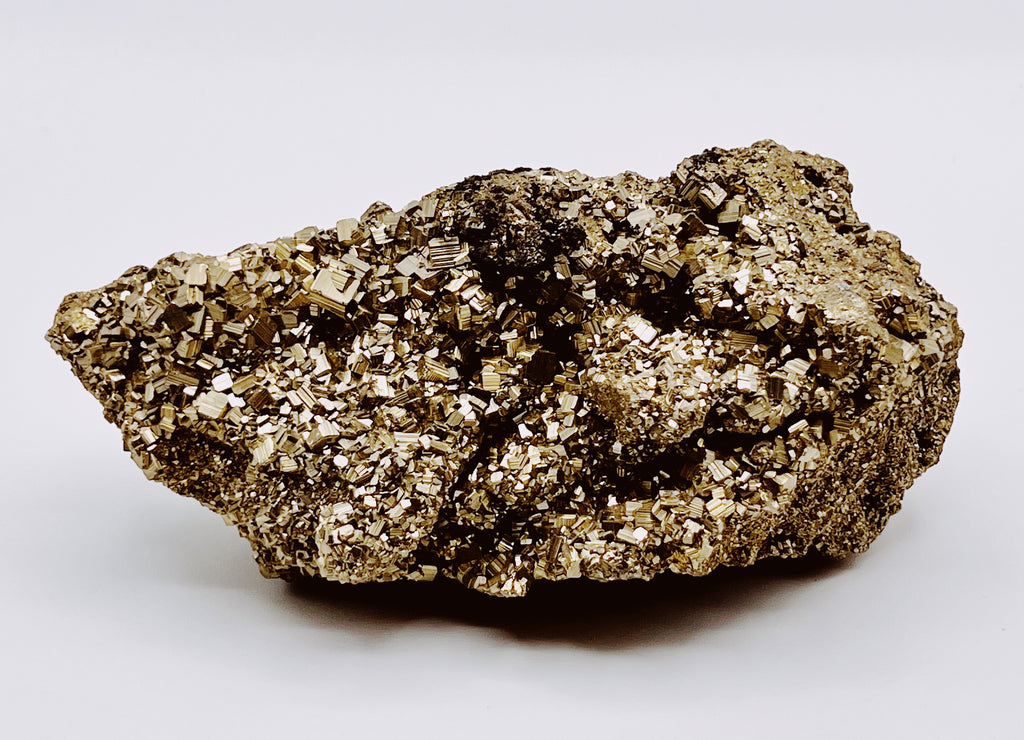 Pyrite, a naturally occurring iron disulfide mineral. The name comes from the Greek word pyr, “fire”, because pyrite emits sparks when struck by metal.