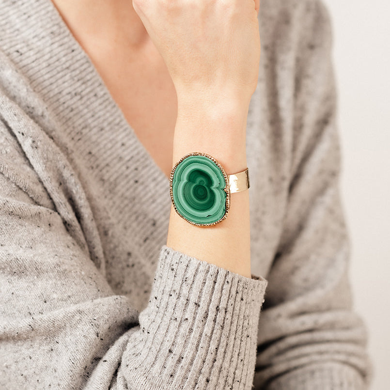 Feel the vibrations—this gorgeous cuff is all about the gem. Pristine malachite is encased in 24k electro-formed gold, detailed with our signature hammered edge. The wide band is adjustable for a piece that truly fits.